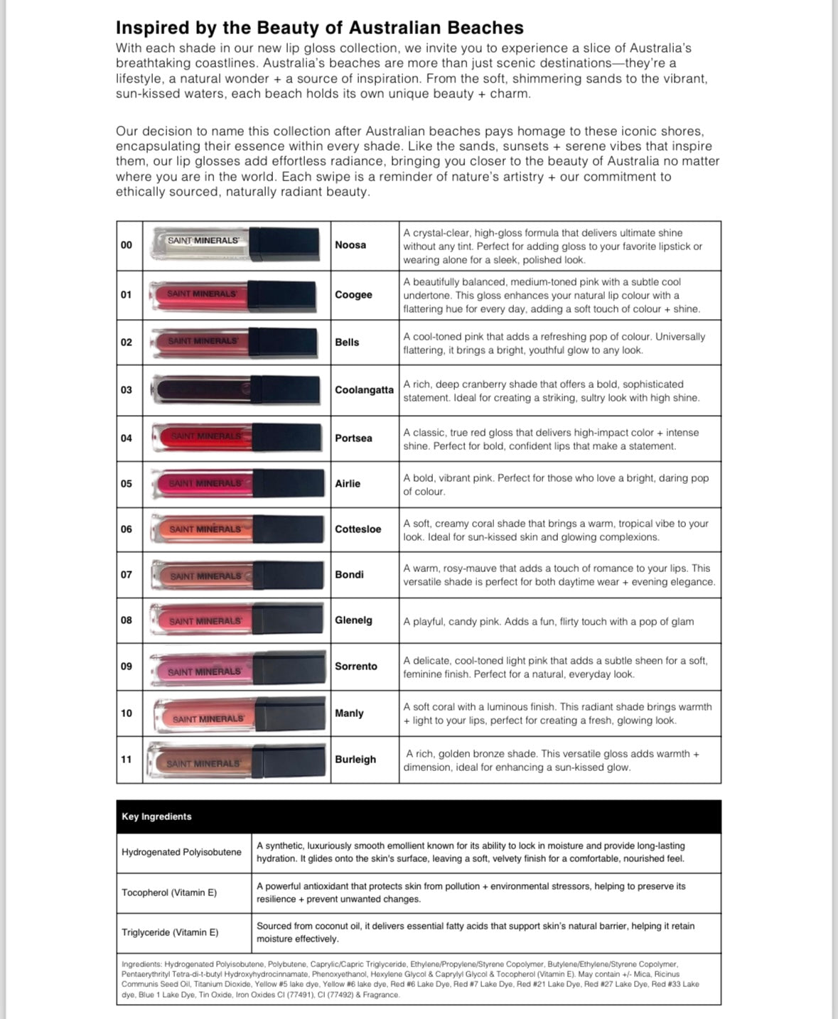 SAINT MINERALS® Lip Gloss features a smooth, non-sticky formula that effortlessly glides across lips, providing a light wash of color + a glossy finish.